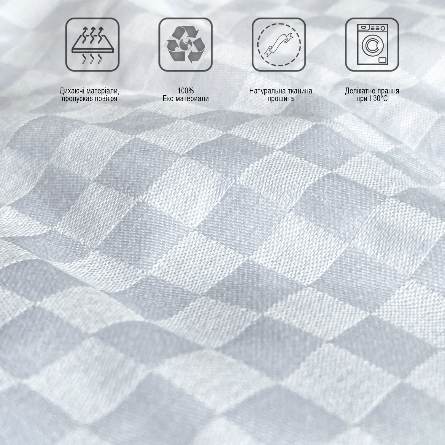 Високоякісний чохол: ковдра виконана з щільної міцної 100% бавовняної тканини «перкаль», що зазвичай використовується у виробництві пухових та шовкових ковдр. Вона довговічна, і через високу щільність гарантовано не пропускає наповнювач.